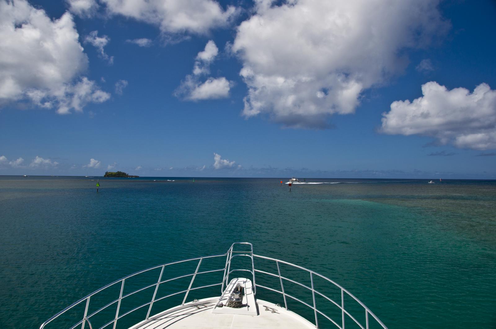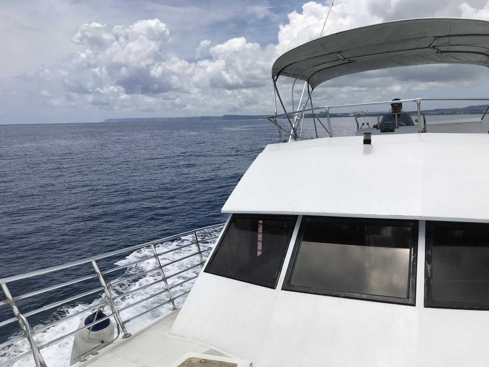 돌고래를 찾으러 항해를 떠나는 동안 괌의 푸른 바다와 하늘 뒤로 펼쳐지는 아름다운 산들과 풍경을 감상할 수 있습니다.