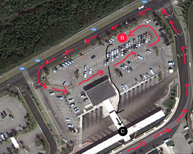1. Follow the red line and drive to the 2nd floor departure area. At point A, drop off your travel companions and luggage.