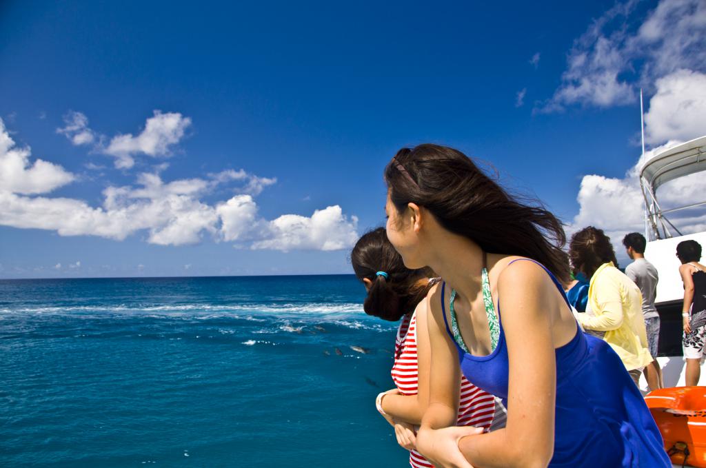 돌고래를 찾으러 항해를 떠나는 동안 괌의 푸른 바다와 하늘 뒤로 펼쳐지는 아름다운 산들과 풍경을 감상할 수 있습니다.